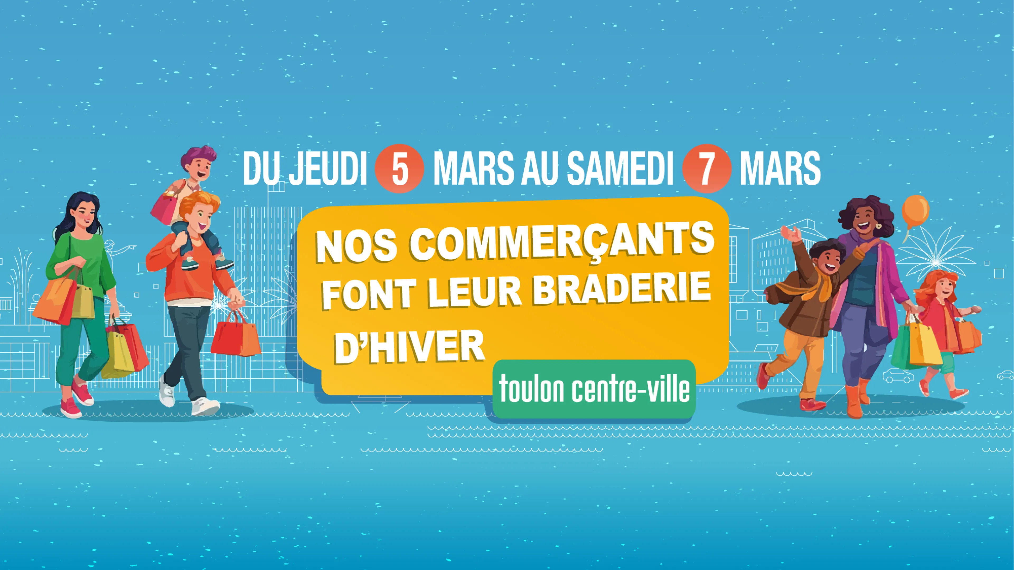 Sur une affiche au fond bleu, au milieu dans un petit encart jaune, il est écrit en lettres majuscules NOS COMMERCANTS FONT LEUR BRADERIE D’HIVER Toulon centre-ville. Dans sa partie inférieure, sont dessinés plusieurs personnages joyeux. À gauche, une femme en pantalon et corsage verts marche en portant plusieurs sacs de shopping, au milieu un homme blond a en main un paquet ; il porte au-dessus de ses épaules un enfant, plus à droite une dame brune est entourée d’un côté d’une petite fille blonde de l’autre d’un garçon qui lève les bras au ciel, un ballon de baudruche flotte au-dessus d’eux.