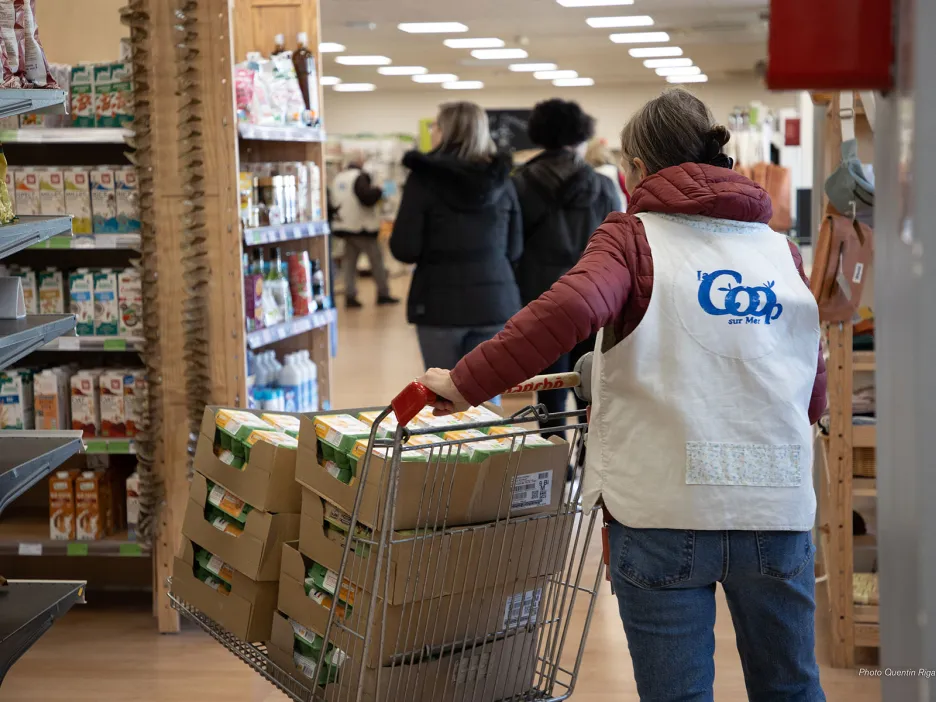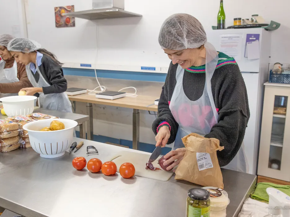 C’est à la Coop sur mer que se déroulent les ateliers culinaires. Par groupes de 10, les bénéficiaires cuisinent un menu composé d’une entrée, d’un plat et d’un dessert. Les recettes sont choisies en fonction des denrées arrivées en date limite de consommation et des légumes de saison. Le troisième groupe s’est réuni le 5 février. Autour de la table, on planche sur le repas du jour qui sera partagé dans quelques heures. Après réflexion et concertation seront préparés une salade de lentilles, un burger végétarien et un gâteau au chocolat et à la courgette… Un petit tour dans les rayons du supermarché coopératif plus tard, il sera remplacé par un gâteau à la pomme, la courgette étant un légume d’été. Parce que Mieux manger pour tous c’est apprendre à concocter des petits plats équilibrés avec des produits de saison, à éviter le gaspillage et à maîtriser son budget.