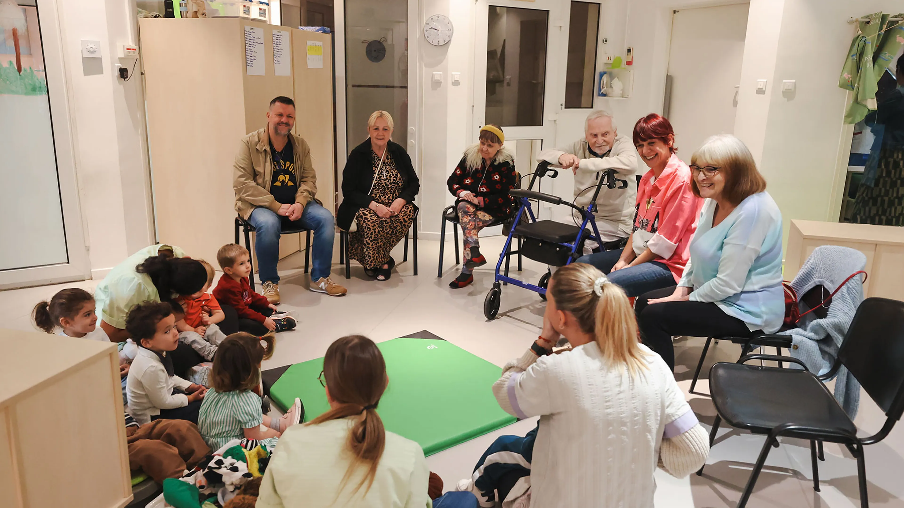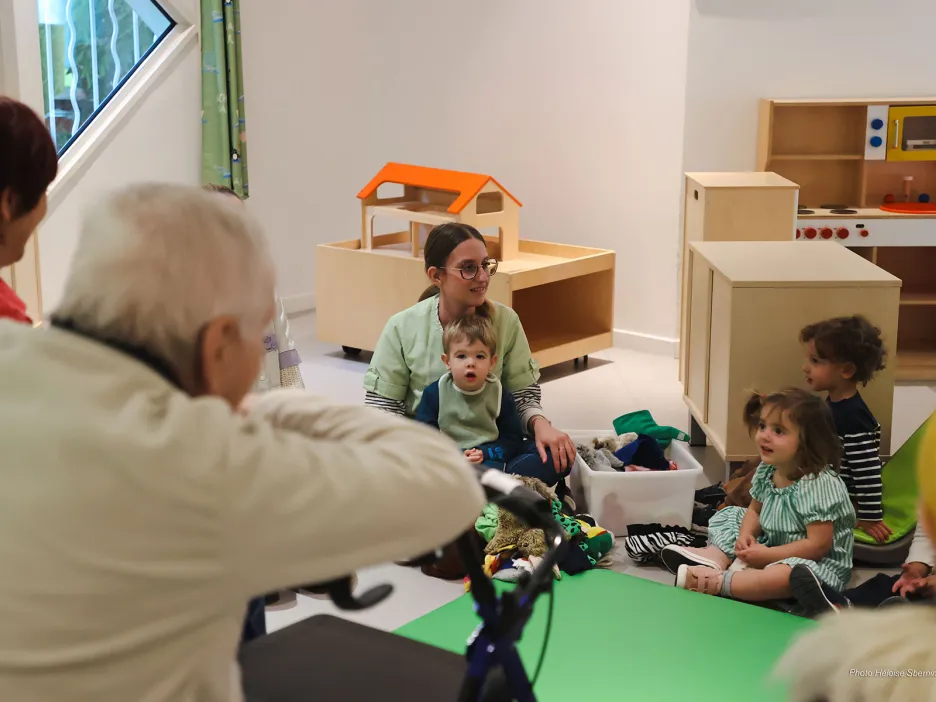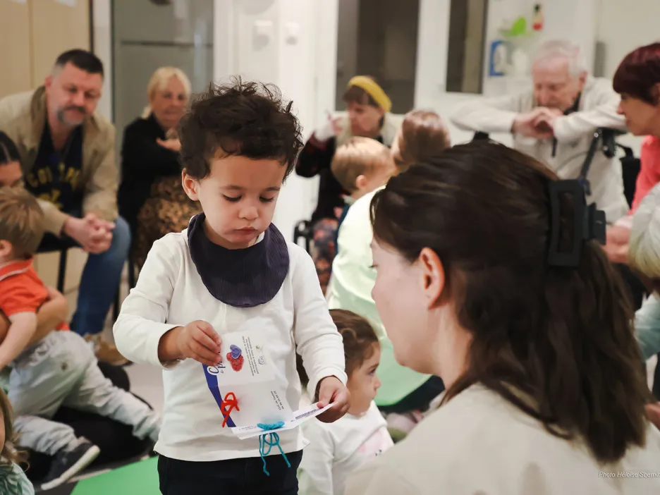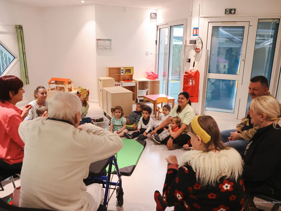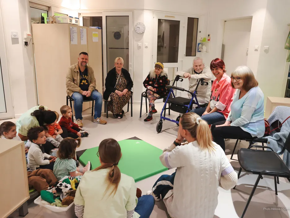 Assis en cercle avec leurs « taties », c’est d’abord avec un peu d’étonnement que Gaëtan, Auguste, Jenna, Azalaïs, Manua et Gabriel, à peine âgés entre 2 ans et 2 ans et demi, ont accueilli Jeannette, Brigitte, Marie-Claire et Bernard, leurs hôtes aux cheveux blancs qu’ils n’avaient jamais vus. Puis Alicia, éducatrice de jeunes enfants, Cécile et Debora, auxiliaires de puériculture, ont entonné des refrains connus autant des tout-petits que des anciens. Les jeunes visages se sont alors éclairés d’un large sourire, tout comme la physionomie des seniors. « Meunier, tu dors », « Une poule sur un mur », « Frère Jacques », « Au clair de la lune », « Une souris verte »… Nul doute que le répertoire de chansons enfantines est une langue universelle, capable de supprimer toute gêne et d’établir des ponts entre les générations. Car peu à peu, les tout-petits ont quitté leur place pour se diriger vers leurs invités. Munis de leurs marionnettes en forme d’animal, avec un petit air espiègle, ils faisaient mine de mordre leurs mains avec la gueule de la peluche. « C’est un « scargo » tient à préciser Gaëtan à Brigitte. « On dirait moi quand j’étais petit » plaisante Bernard, attendri en regardant Ethan.