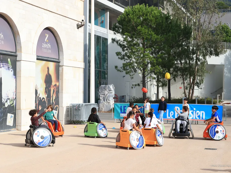 Pétanque, rugby fauteuil, parcours de vélos, street danse… : la matinée était consacrée aux enfants des centres de loisirs toulonnais. Les 6 – 11 ans de Strassel, Saint-Dominique, Jean-Aicard et Debussy avaient fait le déplacement. Par groupe, ils ont testé les différentes disciplines… Et mission accomplie : ils ont bougé, se sont dépensés pendant près de 2 heures. Avec néanmoins, une petite pause autour d’une animation plus calme : le recyclage du matériel de sport.