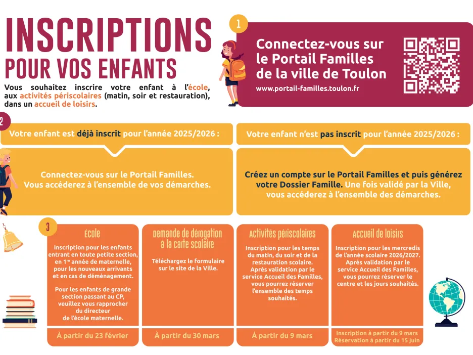 Depuis le 23 février, il est possible d’inscrire ou de réinscrire son enfant dans l’une des 84 écoles de la Ville. Pour cela, les familles doivent se connecter ou créer leur dossier famille sur le portail Familles de la Ville de Toulon. Pour les activités périscolaires et l’accueil en centres de loisirs, les inscriptions ouvriront le 9 mars.