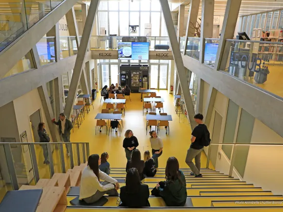 Un groupe d'étudiants qui discutent assis sur des marches d'escaliers à l'intérieur de l'école Kedge Business School à Toulon
