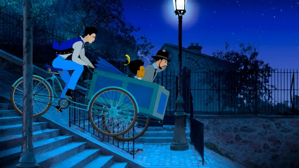 - À droite : Un personnage similaire au masque de fleur semble plus inquiet ou surpris. Plus haut, une figure chevauche une flèche lumineuse pointant vers la droite.